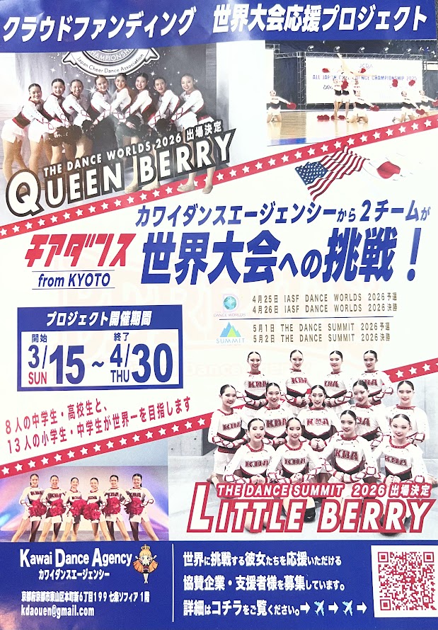 当施設に通っていただいている学生さんが、チアダンスの世界大会に出場することが決まりました。 京都から世界へ。日々の努力の積み重ねが、こうして大きな舞台につながっていることを本当に嬉しく思います。 今回、保護者の方から「ぜ […] -